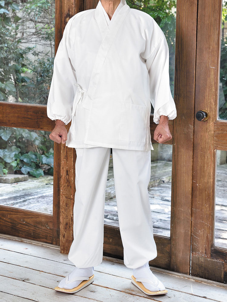 お待たせしました! 人気商品「綾織作務衣 光沢」のゴム袖が満を持して登場! 「やはり桐生の製品は着やすく、輝くね——」 モデルさんも絶賛! ご住職様にも大人気。
