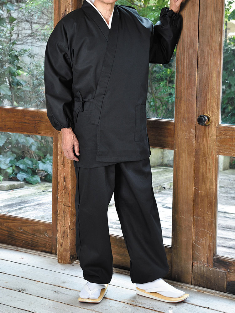 素材 ポリエステル65%、綿35% 製造 日本製 洗濯方法 洗濯機(ネット使用) 仕様 上着:左右ポケット×各1、袖口ゴム使い ズボン:ウエスト前ボタン後ゴム入、ファスナー付き、共布ヒモ付き、裾ゴム使い、ポケット左右×1 サイズ 着丈 裄丈 対応ウエスト ズボン総丈 股下 対応身長 M 74 74 64-95 95 67 160-170 L 77 77 69-100 101 72 170-180 LL 81 79 77-110 106 75 180以上ツヤがあり、着ごたえのある桐生のゴム袖作務衣。